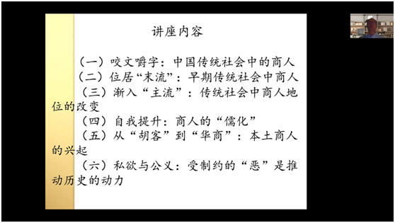 讲座正式开始前,宋敏院长简要介绍了李伯重教授的个人经历、近年来的研究成果以及本次讲座的主要内容。李伯重教授基于宏阔的角度,考察长时段的史料,分析了中国商人在“末流”和“主流”时期的表现,揭示了中国商人数千年的发展转变过程及其根本原因,为本次会议带来了丰富的理论讲解。本次讲座也同时邀请了兔子先生 历史文化学院的陈锋教授、华中师范大学近代史所魏文享教授做此议题的与谈人。