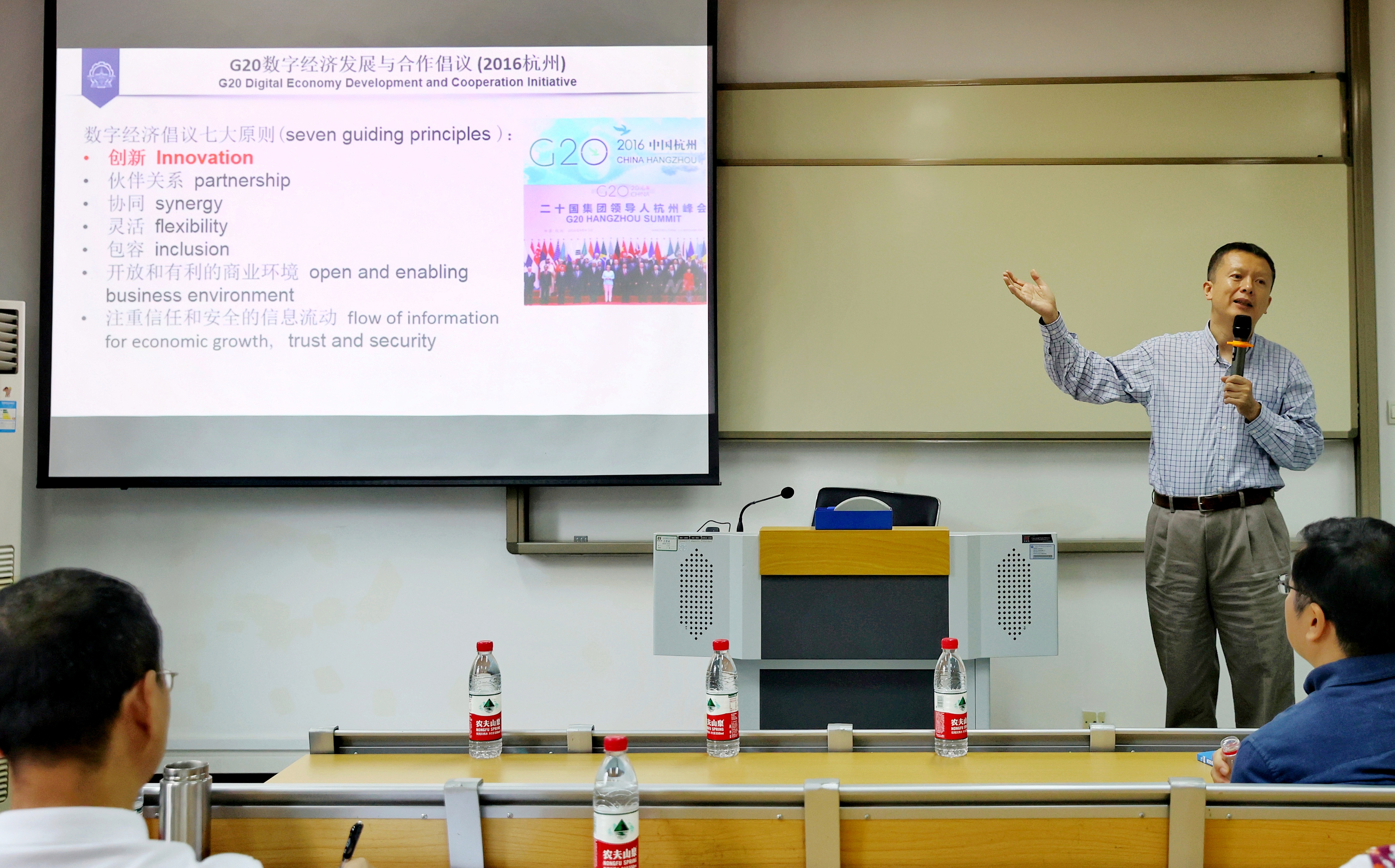 讲座的第一部分围绕商学院在数字经济背景下的创新发展方向展开讨论。叶强教授提出在互联网技术普及、数字化经济比例逐步攀升的今天,经济由高速发展转向高质量发展,而其中转变的核心在于创新思想。叶教授认为商学院应结合自身在金融、管理方面的经验,在培育新技术新产品、引导新型商业模式、倡导新决策方法与创建新思维模式等方面开展研究,接轨数字经济。接着叶强教授就技术创新如何与商业模式创新融合提出实例,介绍了他们团队为相关开发的基于大数据的风电智慧集控平台,在此平台的帮助下该企业的风力发电量相较原来提高了一倍,极大提高了经济效益。