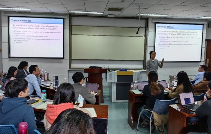 香港浸会大学商学院许寒华副教授发表了题为To Envy or Admire: When and Why Employees Engage or Disengage from Learning from Better Performers的演讲。许教授从“人际学习”的视角深入剖析了企业员工向优秀同事学习的动机与阻碍,指出对绩优同事的嫉妒和钦佩是两个重要的影响员工直接和间接学习行为的机制,同时还探讨了个体谦卑对这两种机制的调节作用。许教授的研究为数智时代员工的自我学习和发展提升提供了重要启示。