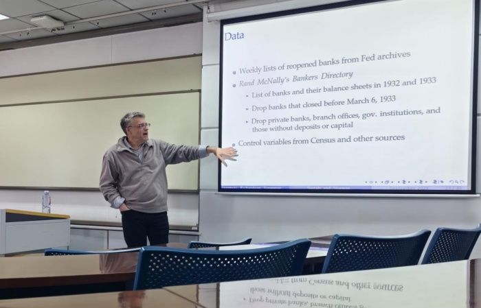 首先,Gary Richardson教授向大家介绍了银行假期的历史背景。1933年3月美国因华尔街股灾爆发和连续多年的经济收缩,使得多家银行存款被恐慌性提出,造成了银行危机,这个情况迫使时任美国总体的富兰克林·罗斯福宣布实行银行假期,并在3月13号后才陆续开放银行营业许可,在这个重新开放的过程中,政府向外界发送了有关银行运营状况的嘈杂信号。而新的微观数据显示,公众对这些信号做出了反应。