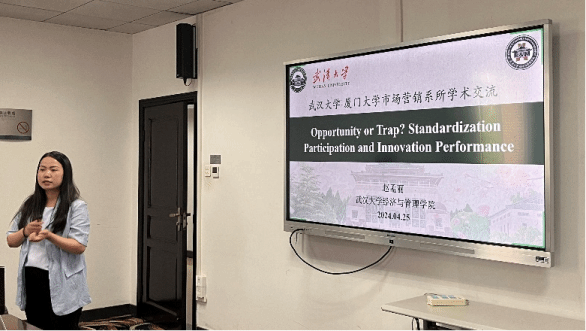 随后,赵孟丽老师分享了工作论文——Opportunity or Trap? Standardization Participation and Innovation Performance(机会还是陷阱?标准化参与与创新绩效),着重探讨中国企业标准化参与如何影响其创新绩效,以及中国市场上“看得见的手”“看不见的手”两种机制的调节效应。老师们围绕标准化参与、标准化接受的概念区别,标准化参与影响创新绩效的理论逻辑等话题展开了互动和讨论。