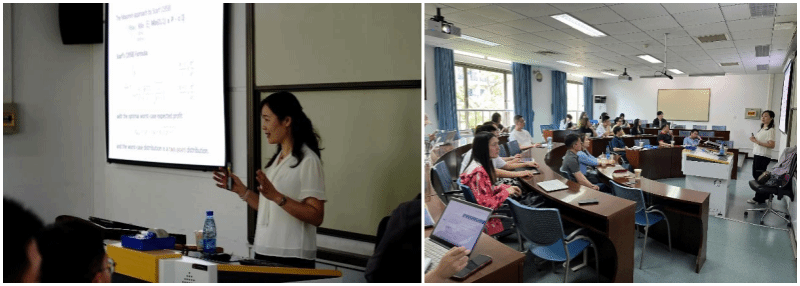 然后,付老师介绍了具体研究内容和主要研究结论:当仅知道需求分布的均值和方差时,研究表明应采用最大最小准则来分析分布鲁棒的采购计划。付老师采用联合优化方法,对鲁棒的采购计划建立了一组最优条件,进一步探究了多源鲁棒采购的组合效应,证明选择两个最合适的供应源组合可以实现全供应源组合效应。