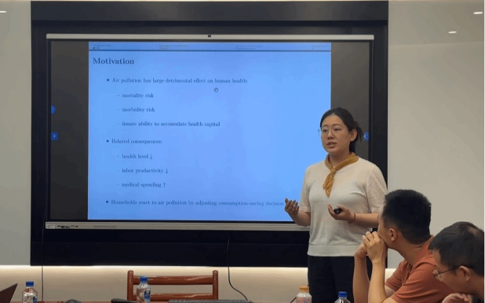 张亚佩老师报告了题为“Household decisions under pollution-induced health risk”的研究。探讨了空气污染对家庭消费储蓄决策的影响。研究发现,在空气污染较为严重的地区,家庭倾向于减少消费性支出,增加安全资产的持有比例,并加大对健康和保险的投资比重。该研究通过构建世代交叠模型,量化了空气污染导致健康风险的福利成本,指出家庭消费的减少主要是由于健康投资增加和劳动生产率下降的挤出效应所致。