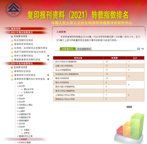 日前,中国人民大学人文社会科学学术成果评价研究中心公布了2021年复印报刊资料转载指数排名。在高等院校所属机构工商管理学科排名中,我校工商管理学科全文转载量及综合指数排名位居全国第一。