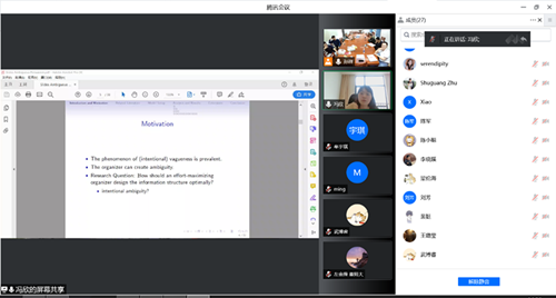 2022年5月19日下午,经济学高级研究论坛第183期在线举行。本次讲座由数理经济与数理金融系孙祥老师主持,邀请南京大学冯欣老师带来主题为“Ambiguous Persuasion in Contests”的学术报告。学院孙祥、李晓蹊、韩立宁等多位老师和学生参加了此次论坛。