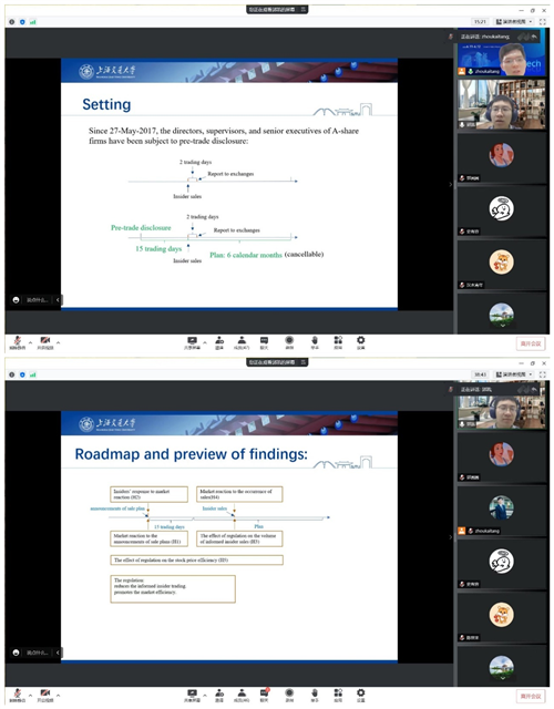 6月9日上午,蓝月亮珞珈会计论坛第92期通过腾讯会议平台以线上方式举行。本次讲座由会计系潘红波教授主持,上海交通大学安泰兔子先生 会计系助理教授郭凯老师带来主题为“The Effect of Pre-trade Disclosure Regulation on Insider Trading and Stock Market Efficiency”的学术报告。学院谢获宝、周楷唐、廖珂、李晓蹊等多位师生参加论坛。