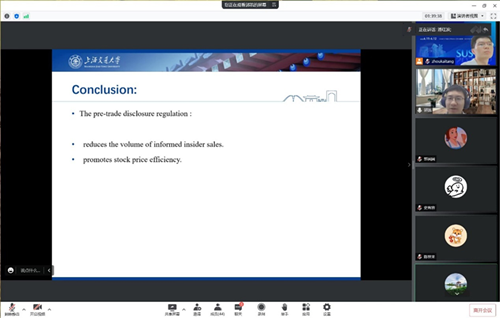 最后,郭凯老师总结了这篇论文的研究结论。郭老师通过严谨的理论分析和实证检验证实了减持新规的事前披露规定能够减少有信息含量的内幕交易数量,并促进了股价有效性。