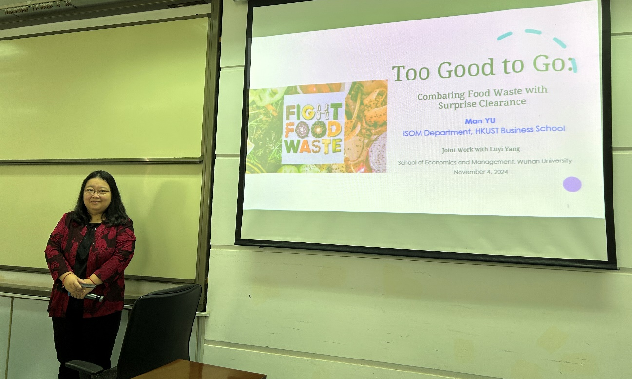 11月4日上午,珞珈经管创新论坛第112期在学院成功举行。本次论坛邀请香港科技大学商学院资讯系统、商业统计及营运管理系(ISOM)于漫(Man Yu)教授作题为“Too Good to Go: Combating Food Waste with Surprise Clearance(好物勿弃——用盲盒清货降低食物浪费)”学术报告。此次论坛由学院管理科学与工程系主办,高宝俊、许明辉、戴宾、柯剑男、李永泉等老师和多名学生及华中科技大学管理学院部分博士生参加,陈植元副教授主持。