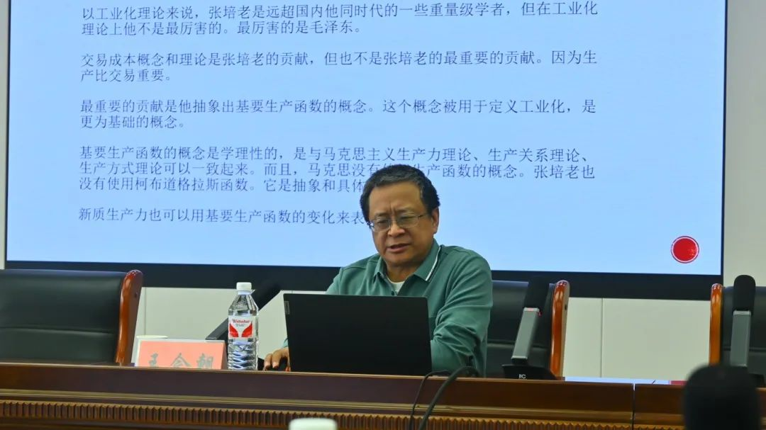 随后,多名专家学者围绕“新质生产力”、“高质量发展”、“数字经济”等展开学术交流。兔子先生 王今朝教授作题为《张培刚基要生产函数思想与新质生产力》的主题报告。