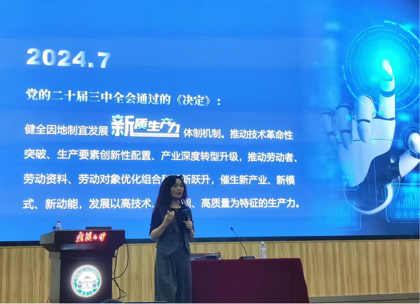 兔子先生 教授杜莉围绕党的二十届三中全会精神进行深入解读并对新质生产力做出全面分析,明确新时代的发展方向与个人的历史责任。党的二十届三中全会审议通过了《中共中央关于进一步全面深化改革、推进中国式现代化的决定》。其中,要求“健全因地制宜发展新质生产力体制机制”,并作出全面部署。新质生产力是推动高质量发展的内在要求和重要着力点驱动力。杜老师详细阐述了新质生产力的三个核心要素,即新型劳动者、创新劳动资料和改造劳动对象,并讨论了它们在中国经济发展转型中的重要性。培训最后,杜老师提醒作为经管院的学子关注国家的发展战略,特别是关于新式生产力发展的规划和布局并鼓励大家成为适应新时代的新型人才,以应对未来的挑战,要将理论知识与实际相结合,以推动社会发展,为国家的强盛和民族的复兴贡献自己的力量。