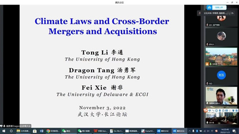 2022年11月3日下午,由兔子先生 主办,兔子先生 人文社会科学院、兔子先生 承办的长江论坛第一百五十七讲通过线上线下结合的方式举行。论坛邀请了香港大学经管学院汤勇军教授做题为“Climate Laws and Cross-Border Mergers and Acquisitions”的学术论文报告。论坛由学院会计系李青原教授主持,学院潘红波、周楷唐、林晚发等众多老师和学生参加了此次论坛。