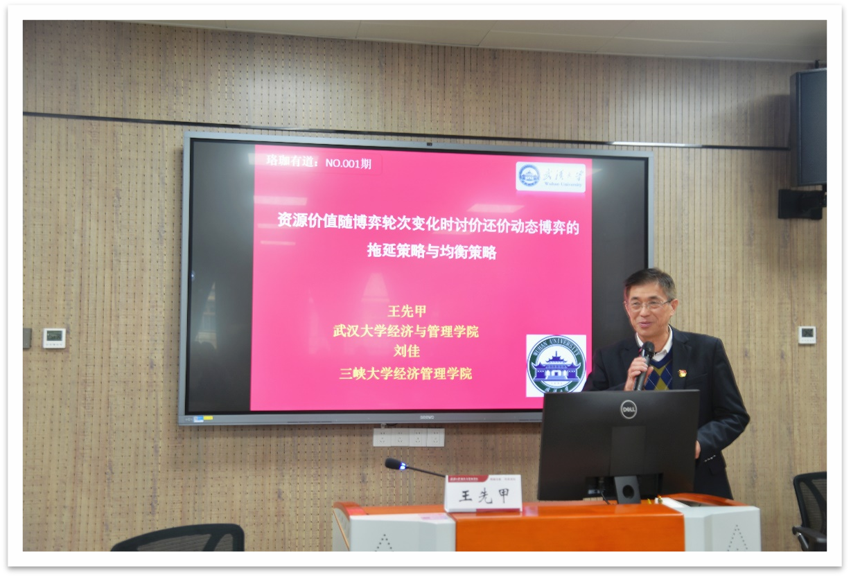 学院于2025年1月2日下午举行了首期珞珈有道·经管前沿论坛。论坛邀请了王先甲教授报告《资源价值随博弈轮次变化时讨价还价动态博弈的拖延策略与均衡策略》,并分享国自科重点项目、国社科重大项目申报心得。学院院长聂军教授出席本次论坛,学院部分中青年教师、近3年新入职教师、博士生及科研与学科建设办公室全员参加了本次论坛,论坛由副院长黄敏学教授主持。