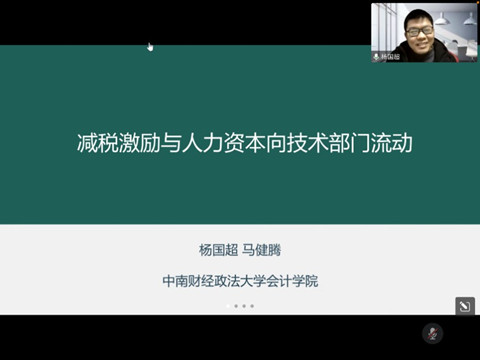 杨国超教授的学术论文报告为“减税激励与人力资本向技术部门流动”。他们的研究主要关注中国劳动力市场存在的严重结构性错配问题,他提到,中国存在以制造业为主的技术部门人力资本匮乏,同时以金融业为主的垄断部门人力资本冗余的现象,这成为阻碍中国经济高质量发展的重要因素。鉴于此,他们考察了减税激励与中国劳动力市场的结构性错配之间的关系,并且围绕研究动机、理论分析、政策背景、研究方法、主要结论和政策建议等方面展开讲座。