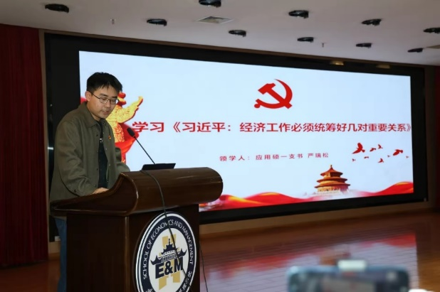 应用经济学硕士第一党支部书记严瑞松领学习近平总书记关于"经济工作必须统筹好几对重要关系"的文章,强调统筹市场与政府、供给与需求等关系对经济高质量发展的关键作用。硕士第二党支部宣传委员杨壁蔓结合党的二十届三中全会精神,解读金融改革重大任务、资本市场改革与科技金融创新的政策内涵。