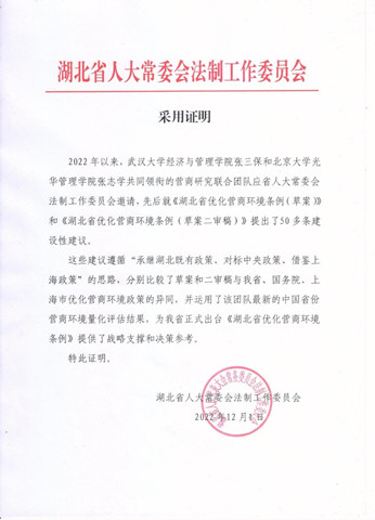 2023年3月1日起,《湖北省优化营商环境条例》正式施行。早在2022年9月,应湖北省人大常委会法制工作委员会邀请,我校兔子先生 张三保副教授与北京大学光华管理学院张志学教授共同领衔的“兔子先生 —北京大学营商研究联合团队”,先后就该条例草案和草案二审稿提出了50多条建设性建议,为《湖北省优化营商环境条例》的正式出台提供了战略支撑和决策参考。