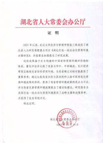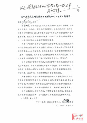2021年2月,张三保副教授向时任湖北省人大常委会党组书记王玲副主任请示在我校设立校级研究平台“湖北营商环境研究中心(智库)”,获得王玲副主任肯定性批示:“成立营商环境研究中心是一件好事,全力支持”。
