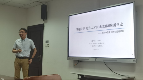 中国人民大学周广肃老师带来了题为“鸿雁衔智:地方人才引进政策与家庭创业——来自中国准自然实验的证据”的报告。文章利用各城市出台的人才引进政策所形成的准实验,通过中国家庭追踪调查(CFPS)2010-2018年的数据及与之匹配的城市层面人才引进政策数据,首次考察了地方人才引进政策对家庭创业决策的影响。研究表明,地方人才引进政策显著促进了家庭的创业行为,且高物质资本、高人力资本和高社会资本家庭对这一政策的反应更为强烈。