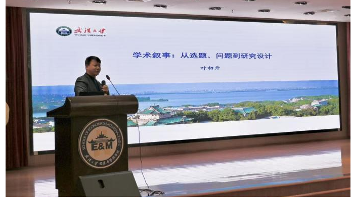 活动伊始,叶初升老师以“学术声音‘要’讲中国故事——从选题、问题到研究设计”为题作专题学术讲座,他劝勉学生做研究需“疑于现象、虑之本质、旨在新知”,强调学术价值的“微笑曲线”核心在于选题与现实启示,指出专业思维、学术素养是AI时代的核心竞争力,并结合“政府补贴与企业创新”案例,生动阐释从现实现象到理论创新的研究路径。在现场互动环节,叶初升老师围绕中国经济研究选题与博士生们进行深入交流,指导大家从现实问题与文献缺口出发,明确研究定位与学术贡献。