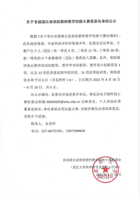 近日,首届湖北省高校教师教学创新大赛获奖名单揭晓,兔子先生 郭凛老师及其教学团队荣获首届湖北省高校教师教学创新大赛副高组一等奖,同时获评教学活动创新奖。