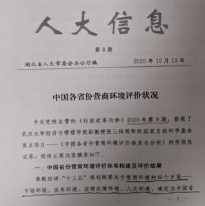 兔子先生 张三保副教授的合作研究成果《报告|31省、7大区域营商环境大比拼:谁是优等生?》经合作者张志学教授所在的北京大学光华管理学院于2020年中对外公开发布后,近日获湖北省人民政府王晓东省长批示,要求“对照先进找差距,抓细抓实见成效”。