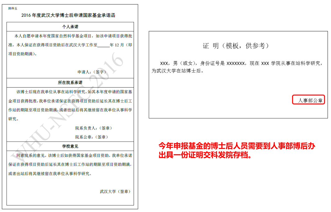 5. 在站博士后申请书必须附《博士后申请国家基金承诺书》 ,并到学校人事部博后办开据相关证明(附件图示)。