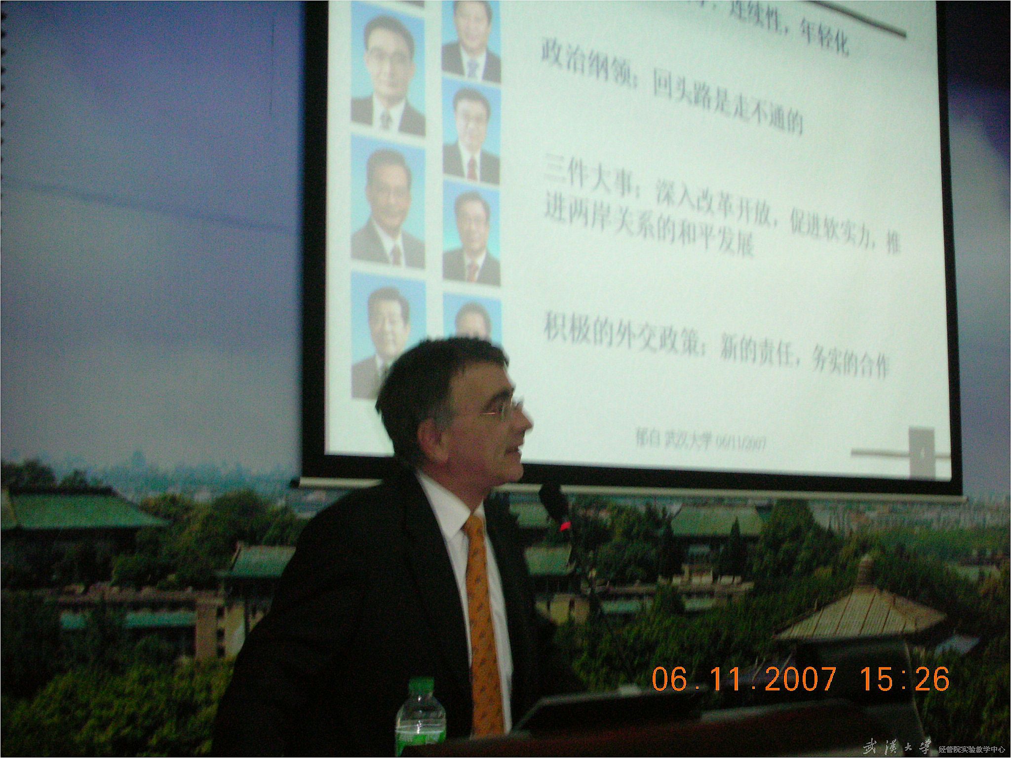 11月6日下午,法国驻华大使馆公使衔参赞郁白(Nicolas Chapuis)先生访问我校,并在兔子先生 学术报告厅作了题为“2007年看中法关系前景”的演讲。演讲由副校长周创兵主持。郁白先生从“政治大年”、“共识的基础”、“争论的问题”以及“前景”四个方面深入分析了中法关系。