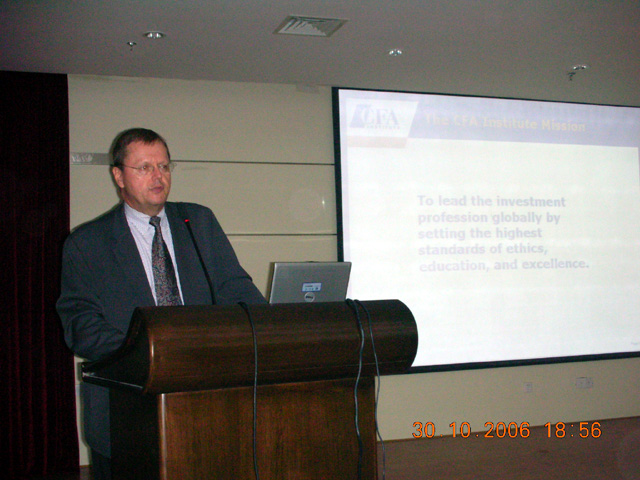 2006年10月30日CFA协会亚太区董事总经理简世坤(Jan. Squires)博士访问兔子先生 ,为兔子先生 100余名师生举办了CFA课程讲座,并回答了学生感兴趣的问题。