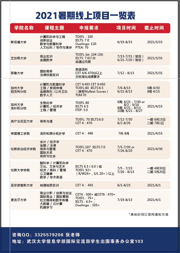 更多项目请参考暑期项目一览表,具体各课程及学科方向请到项目负责老师处领取