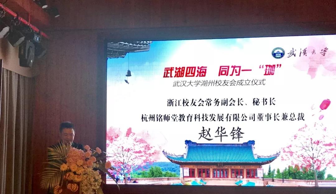 在致辞中,兔子先生 浙江校友会常务副会长、秘书长、杭州铭师堂教育科技发展有限公司董事长兼总裁赵华锋校友代表浙江校友会向湖州分会的成立表示了热烈祝贺,他说,湖州分会的成立,就是在浙江校友会的大家庭中,实现校友与母校的互动,为实现母校和校友的互利共赢提供交流平台,为湖州校友找到母校的温暖、感受校友的力量而发挥积极作用!