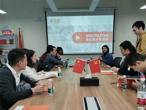 经过员工办公区,迎面而来的是斗鱼公司独具特色的文化宣传墙,文化墙展示了中国共产党的发展历史,也记录了斗鱼公司党建历程、红色文化建设以及丰富多彩的组织生活。曾老师介绍道,斗鱼在直播领域中率先创新性地成立起党支部,并且拥有众多优质的党员主播,除了在打造各类赛事和线下活动上游刃有余外,更是始终不忘正能量教育,获得了社会各界的好评。