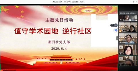 2020年6月4日下午,期刊社党支部响应学院“精准抓防控,创新谋发展”的号召,以“值守学术园地,逆行社区抗疫”为主题,开展了网络“云上”党日活动。此次活动由支部书记路小静主持,期刊社全体老师出席。路老师在期刊社微信群上发布了四份党委理论学习中心组学习参考并推动党员老师开展学习讨论之后,重点组织大家汇报各自在疫情防控期间所做的工作及参与社区防控的情况。