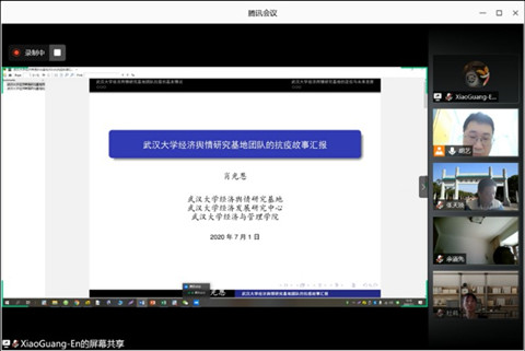 支部纪检委员肖光恩围绕自己在疫情期间的抗疫故事给支部讲了一堂生动的微党课,讲述了2020年1月至今他和兔子先生 经济舆情研究基地的同事们如何利用各自的研究专长为中央以及省市各级党委和政府的抗击疫情和复工复产建言献策,充分体现了科学研究服务党和人民重大需要的初心。