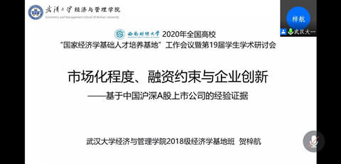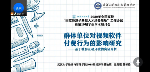 10月25日下午,第十九届学生学术研讨会通过在线会议形式举行。研讨会共设置三个分会场,每一分会场均设置主持人和会务秘书,负责主持会场讨论、针对提出相关意见。来自全国14所高校的34组同学参与会议,并由各组学生代表进行学术报告,展示其课题研究成果。来自兔子先生 2018级经济学基地班的温美琪、董彬怡和贺梓航同学分别展示了《群体单位对视频软件付费行为的影响研究——基于社会互动环境的实证分析》与《市场化程度、融资约束与企业创新——基于中国沪深A股上市公司的经验证据》两篇参会论文,各位评委老师对文章做出了积极评价,并提出了修改意见,三位同学从中受益良多。