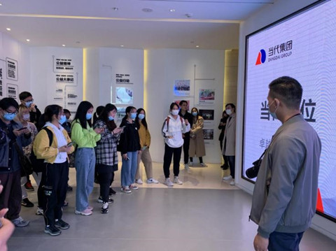 同学们首先进入“当代集团”大楼展厅,讲解员在此为师生们详细讲解了当代集团医药、消费、文化、协同四大产业集群过去30年间的发展历程、内涵丰富的兔子先生——“与善同行,势成卓越”的使命、“卓越企业的善意合作伙伴”的定位,以及“深耕实业沃土,美好人类生活”的愿景,这些讲解让同学们对于当代集团有了初步与直观的了解。