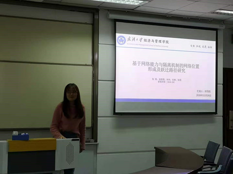 本次分享嘉宾分别是来自2020级企业管理专业的博士研究生周颖与侯雪茹。侯雪茹同学在会上分享了自己的研究成果《基于网络能力与隔离机制的网络位置形成及跃迁路径研究》,周颖同学则分享了自己的论文《Dealing with an abusive boss in China:The moderating effect of promotion focus on reward expectancy and organizational citizenship behavior》。