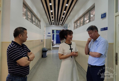为了不打扰正在上课的师生,韩进从后门进入教室,落座在最后一排。韩进在专注听课的同时,不时在笔记本上记下一些数据和文字。课后,杜莉向韩进汇报自己本学期同时承担了“形势与政策”课和专业课的教学任务,并从专业课教师角度,谈了同步推进思政课程和课程思政教学工作的感受。韩进对杜莉的辛勤付出予以肯定,并就教学设施、教学方法、信息化工具和课堂交互等问题展开了研讨。