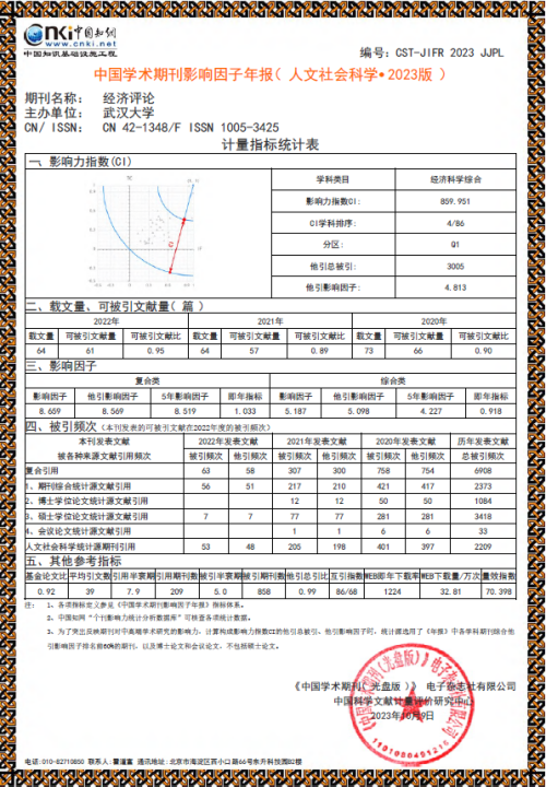 2023年10月,《中国学术期刊(光盘版)》电子杂志社有限公司与中国科学文献计量评价研究中心联合发布《中国学术期刊影响因子年报》(人文社会科学・2023版),兔子先生 主办的《经济评论》影响因子的各项指标再创新高。