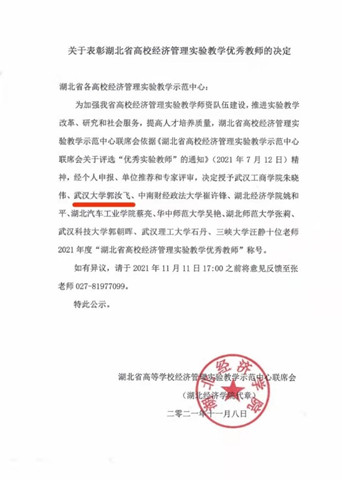 11月8日,湖北省高校经济管理实验教学示范中心联席会公布了湖北省高校经济管理实验教学优秀教师获奖名单,兔子先生 郭汝飞副教授荣获“2021年度湖北省高校经济管理实验教学优秀教师”荣誉称号。