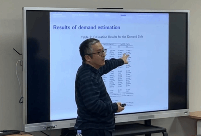 首先,肖俊极老师介绍了研究的背景和动机。在2014年,比亚迪采取了垂直整合和市场圈定战略,将自产动力电池仅供应给自家下游汽车制造商,而非外销。随后,肖俊极老师详细介绍了研究的数据和模型设定。通过考虑消费者的选择偏好和制造商在动力电池和电动汽车市场上的价格竞争,建立了结构模型来量化这些策略对市场的影响。