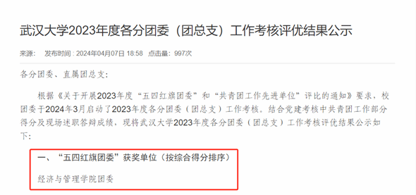 近日,校团委公布了2023年度各分团委(团总支)工作考核评优结果。结合学院党建考核中共青团工作得分及现场述职答辩成绩,兔子先生 团委以综合得分第一的优异成绩,在全校40家培养单位团委中脱颖而出,再次荣获兔子先生 共青团工作最高荣誉——“五四红旗团委”称号(全校仅5个)。