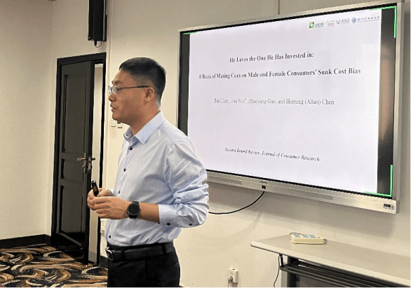 聚焦于恋爱关系,陈瑞老师从沉没成本的角度分析求偶线索如何影响消费行为中的沉没成本偏见。通过十六项实验,陈老师发现求偶线索显著增加了男性在消费中的沉没成本,而实施型心态中介了这一过程。然而,由于求偶策略上的差异,这一效应在女性消费者中并不显著。此外,陈老师还区分了沉没成本偏见与现状偏见,并排除了情绪反应、过度自信等多种可能的替代解释。陈老师细致分享了中介机制的实验方法、实验心得。老师们就进化心理学、亲代投资理论等理论逻辑、实验方法展开探讨,相互交流学习。