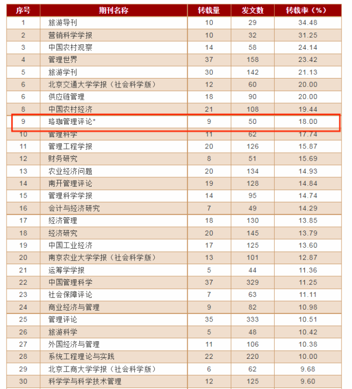 表3 管理学科全文转载率排名表