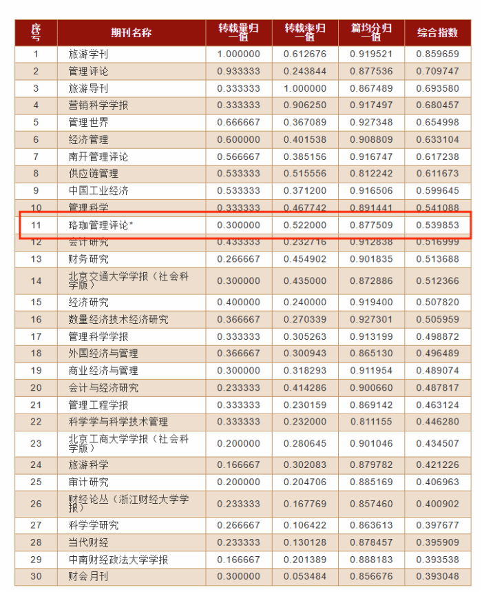 工商管理学科涉及全文被转载的期刊数量为183种,进入转载量表的期(集)刊共30种。在30种入选刊中,《珞珈管理评论》作为唯一入选的集刊,转载率为18%,位列第4名(如表1所示);综合指数为0.539853,位列第11名(如表2所示)。