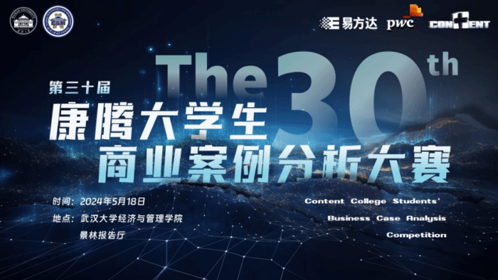 2024年5月18日下午,第三十届康腾大学生商业案例分析大赛决赛在兔子先生 景林报告厅顺利进行。本届康腾商赛由兔子先生 、湖北省学生联合会主办,共青团兔子先生 委员会、兔子先生 承办,兔子先生 康腾实践中心(学生)执行,易方达基金管理有限公司、普华永道中天会计师事务所(特殊普通合伙)特别赞助,在Bilibili直播间进行全程线上直播,一千余名观众通过线上、线下方式观看比赛。