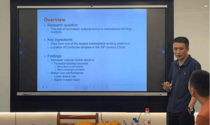 张博老师带来了题为“Does Borrowers’ Cultural Norms Matter in Marketplace Lending? Evidence from Local Confucianism”的报告。通过使用中国最大的市场借贷平台之一“人人贷”的数据,发现借款人居住地区儒家文化价值观的流行程度与其贷款申请获得资助的概率和筹款金额之间存在正相关关系,揭示了文化规范在缓解市场借贷中的逆向选择和道德风险问题方面所起的独特作用。