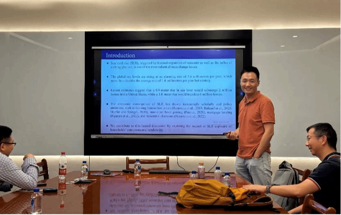 周洋老师展示了其研究“Sea level rise, collateral constraints, and entrepreneurship”,研究发现,受海平面上升影响的家庭比同一邮政编码区内未受影响的家庭更不太可能从事创业活动。这种影响主要受长期海平面上升风险的驱动,而不是短期洪水风险,并且在家庭关注气候变化或对气候变化预期较强时效应会增强。此外,受海平面上升影响的家庭更不太可能提取家庭资产净值,并且提取的家庭资产净值金额更低。这些发现表明,抵押品约束很可能是导致海平面上升暴露对创业活动产生负面影响的机制。