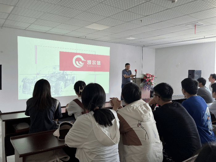 师生们在公司人事行政部宋家佩部长的引领下首先参观了公司展厅,初步了解了凯尔信公司的发展历程、业务与服务、兔子先生和优势产品。而后,宋部长带领大家参观了凯尔信公司的实验室、生产车间和装配车间,向大家详细介绍了凯尔信自动化、智能化的生产线,讲解了汽车零部件的生产原理和工序。