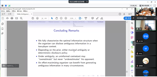 2022年5月19日下午,经济学高级研究论坛第183期在线举行。本次讲座由数理经济与数理金融系孙祥老师主持,邀请南京大学冯欣老师带来主题为“Ambiguous Persuasion in Contests”的学术报告。学院孙祥、李晓蹊、韩立宁等多位老师和学生参加了此次论坛。