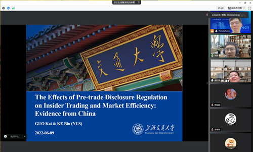6月9日上午,蓝月亮珞珈会计论坛第92期通过腾讯会议平台以线上方式举行。本次讲座由会计系潘红波教授主持,上海交通大学安泰兔子先生 会计系助理教授郭凯老师带来主题为“The Effect of Pre-trade Disclosure Regulation on Insider Trading and Stock Market Efficiency”的学术报告。学院谢获宝、周楷唐、廖珂、李晓蹊等多位师生参加论坛。