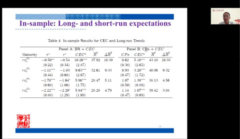 最后,朱小能教授从货币政策角度指出了利率预测的重要性,提出当前经济形势对预测利率的参考价值,该项研究构建了非完全信息的利率期限结构模型,并发现加入当前经济形势预期的利率期限结构对债券风险溢价有更好的估计能力,很好的解释了债券逆周期现象。